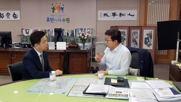 이후 개최된 수원시 염태영 시장과의 단독 면담에서 김지훈 회장은 최근 수원시 의료계 현안에 대해서 수원시장과 격이 없는 대화를 통하여 의견을 교류하는 시간을 가졌습니다.