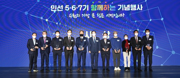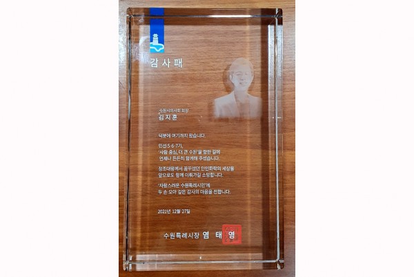 김지훈 원장이 2021년 12월 27일 수원컨벤션센터에서 개최된 ‘민선5·6·7기 함께하는 기념행사’에서 염태영 수원특례시장으로부터 ‘감사패’를 받았습니다.