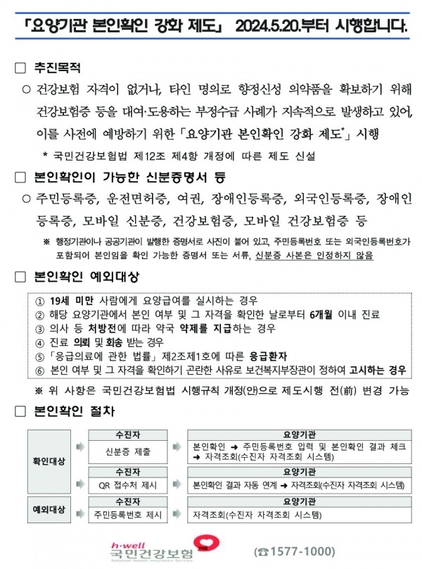 병의원에서 건강보험을 적용받으려면 신분증 제시 등 본인 확인 절차 의무화 시행(2024년 5월 20일 시행)