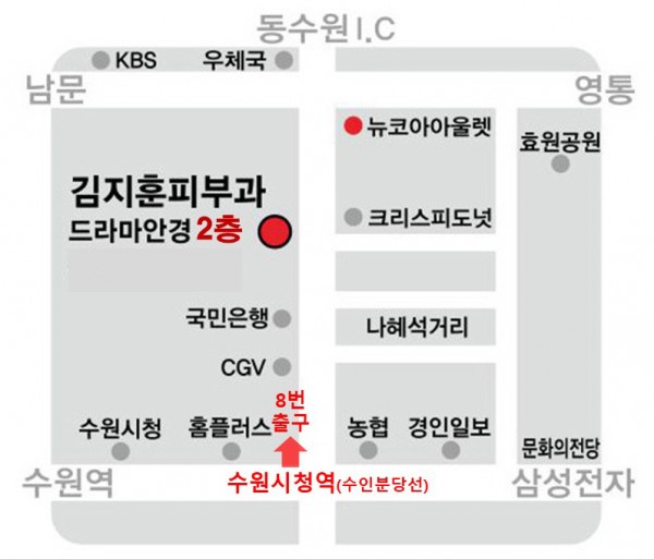 [16489]경기도 수원시 팔달구 권광로 197 (인계동, 남현프라자 2층) 김지훈피부과의원